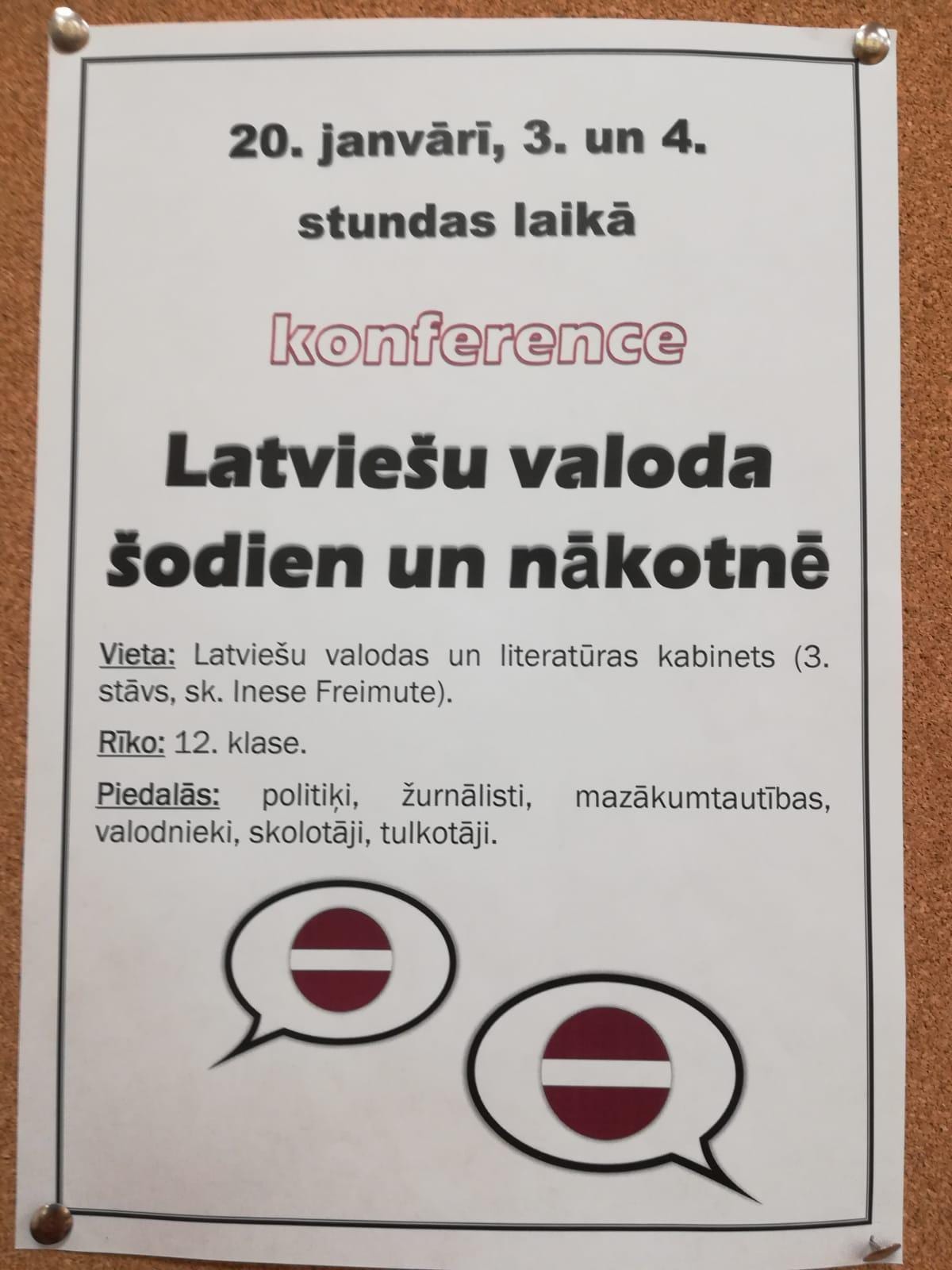 20.janvārī latviešu valodu stundu laikā 12.klase rīkoja konferenci. Tā tika organizēta kā mācību metode, kuras laikā skolēniem bija jāiejūtas konferences dalībnieku lomā un jādiskutē par tēmu „Latviešu valoda šodien un nākotnē”.