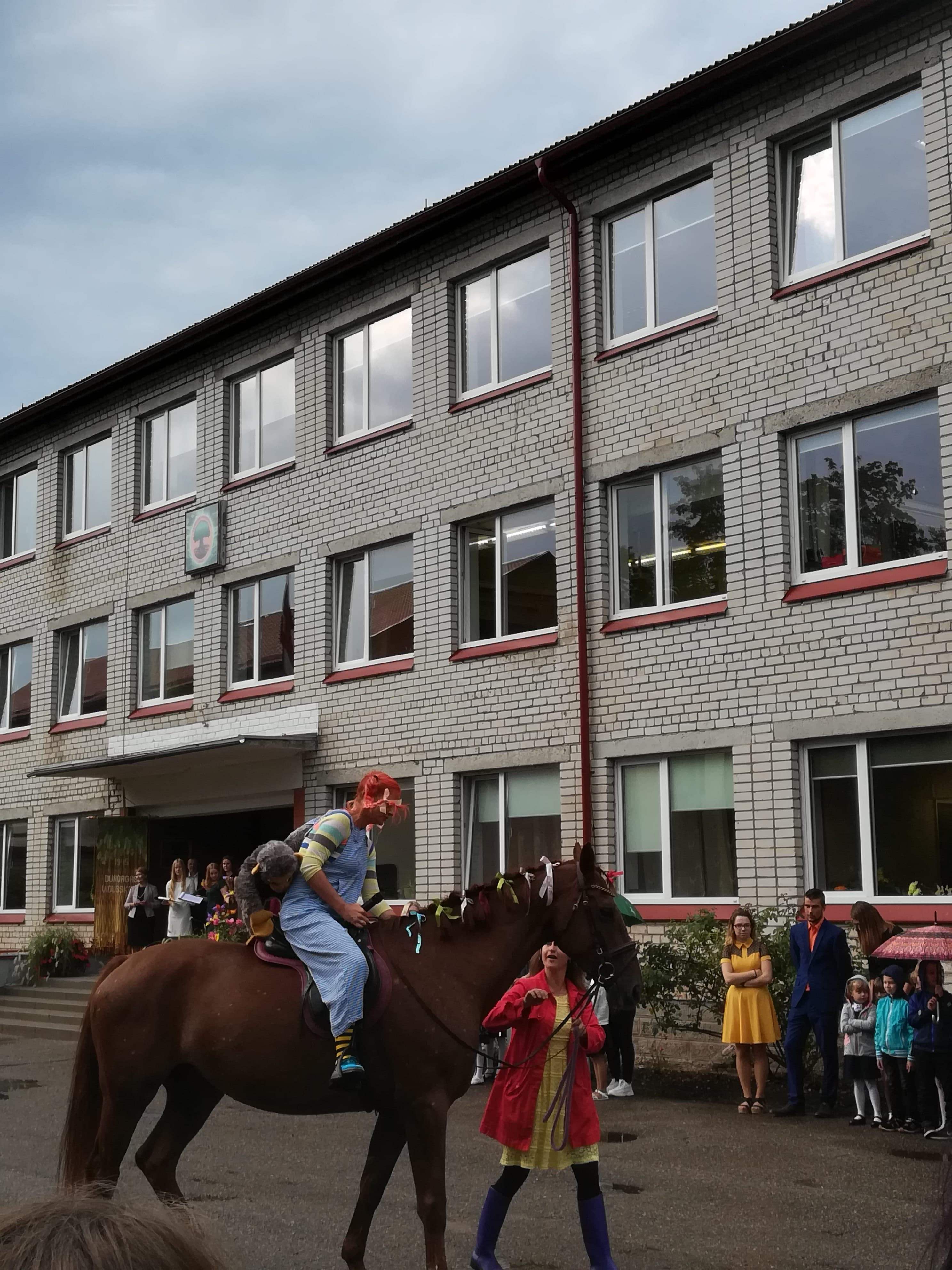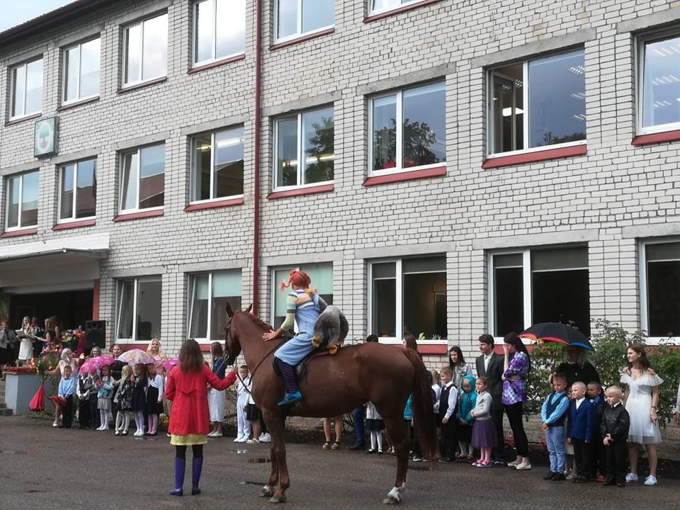 Mācības mūsu skolā gribēja uzsākt arī Pepija Garzeķe! Viņas ierašanās un jaukā komunikācija ar svētku dalībniekiem pasākumā bija brīnišķīgs pārsteigums, nebijis notikums! Pepija ieradās jāšus – īsta zirga mugurā! Ar visu pērtiķīti Nilsona kungu!