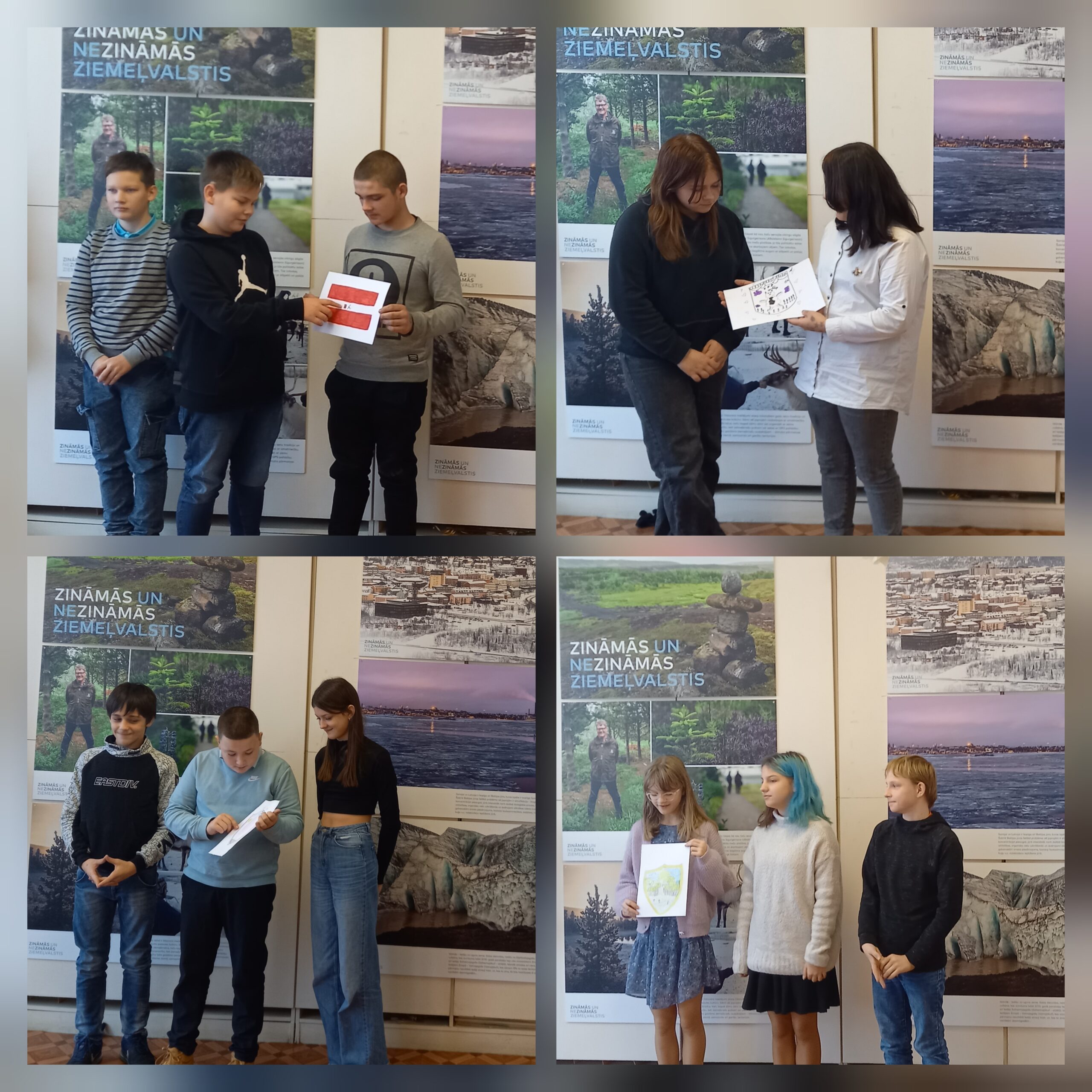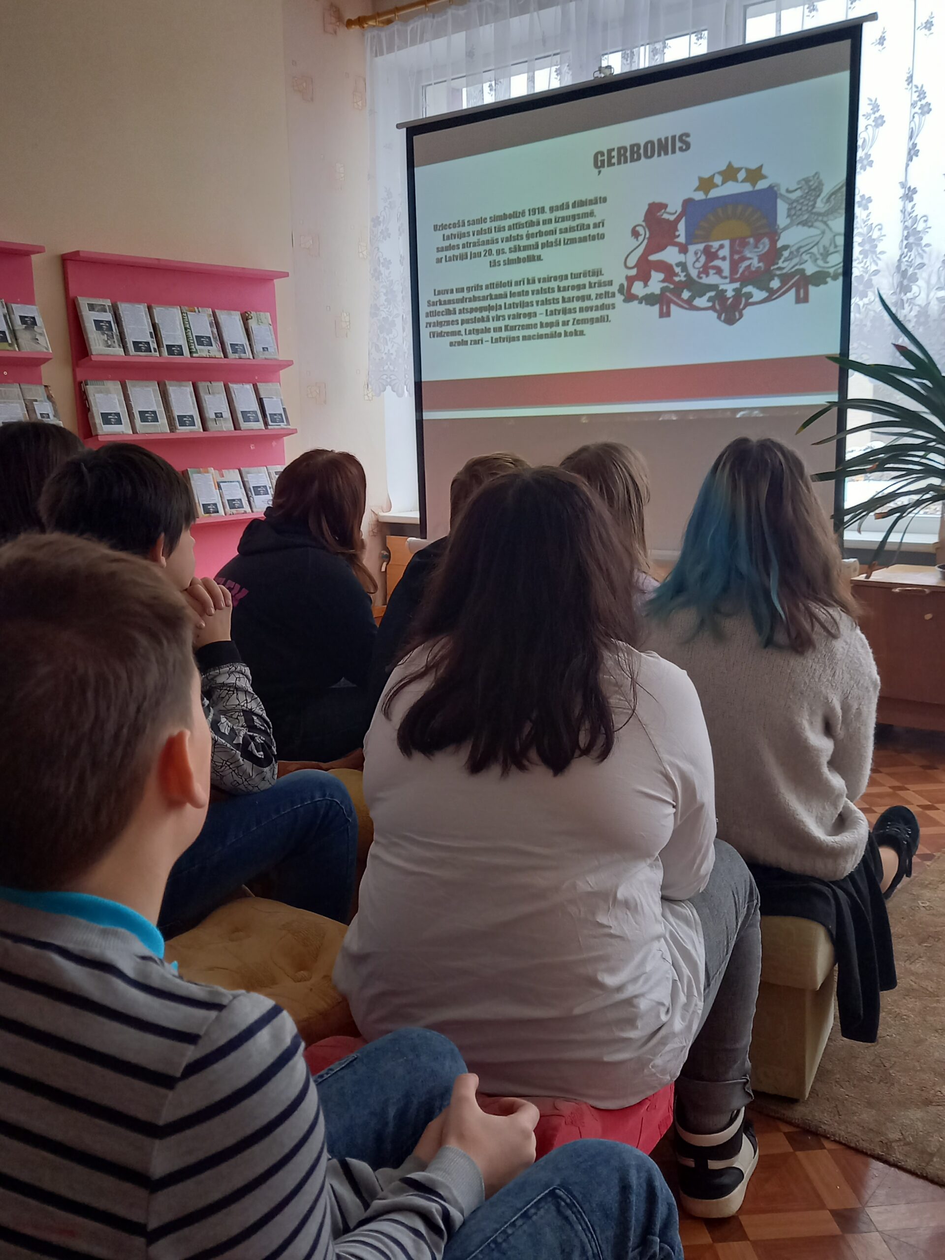 Nodarbības laikā 6.a klase iepazinās ar Ziemeļvalstīm, to dabu un literatūru – aplūkojot gan Ziemeļvalstu autoru literāro darbu izstādi, gan Ziemeļvalstu Ministru padomes izveidoto izstādi “Zināmās un nezināmās Ziemeļvalstis” (salīdzinot fotoattēlos redzamos skatus ar Latvijas dabu); noklausījās un pārrunāja fragmentu no Marijas Parras grāmatas “Glimmerdāles Tonje”; nostiprināja zināšanas par Latvijas valsts simboliem, īpašu uzmanību pievēršot Latvijas valsts ģerbonim un Latvijas pilsētu ģerboņiem (skolēniem bija iespēja arī spēles veidā pilnveidot gan savas zināšanas, gan atmiņu, spēlējot savos telefonos spēli par ģerboņiem).