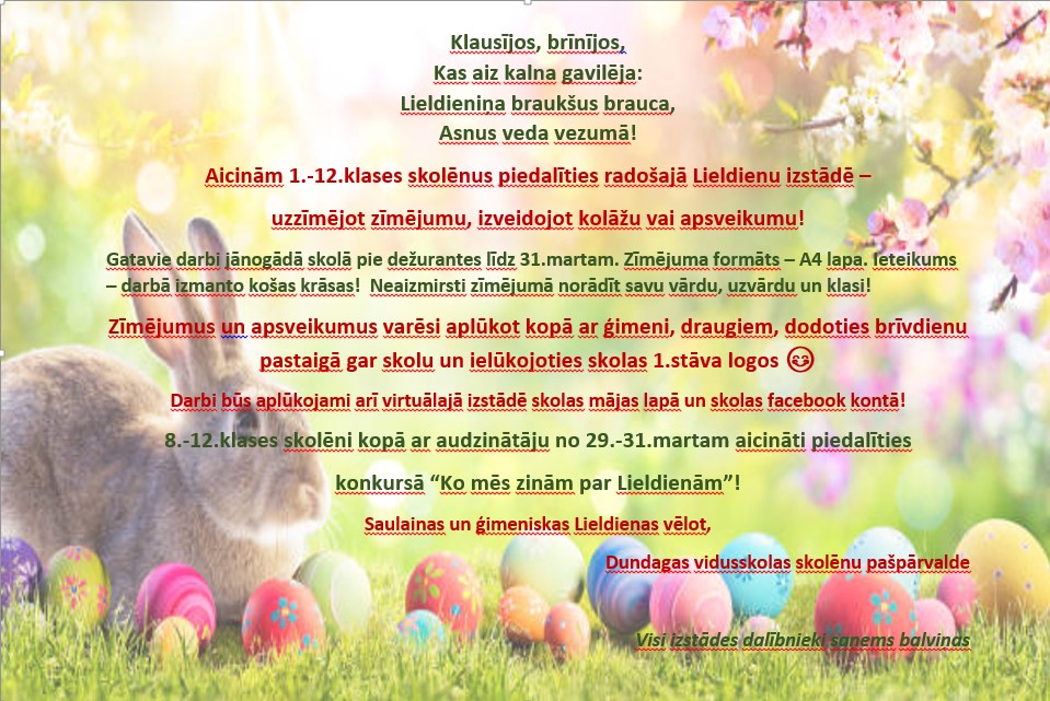 Aicinām 1.-12.klašu skolēnus piedalīties radošajā Lieldienu izstādē