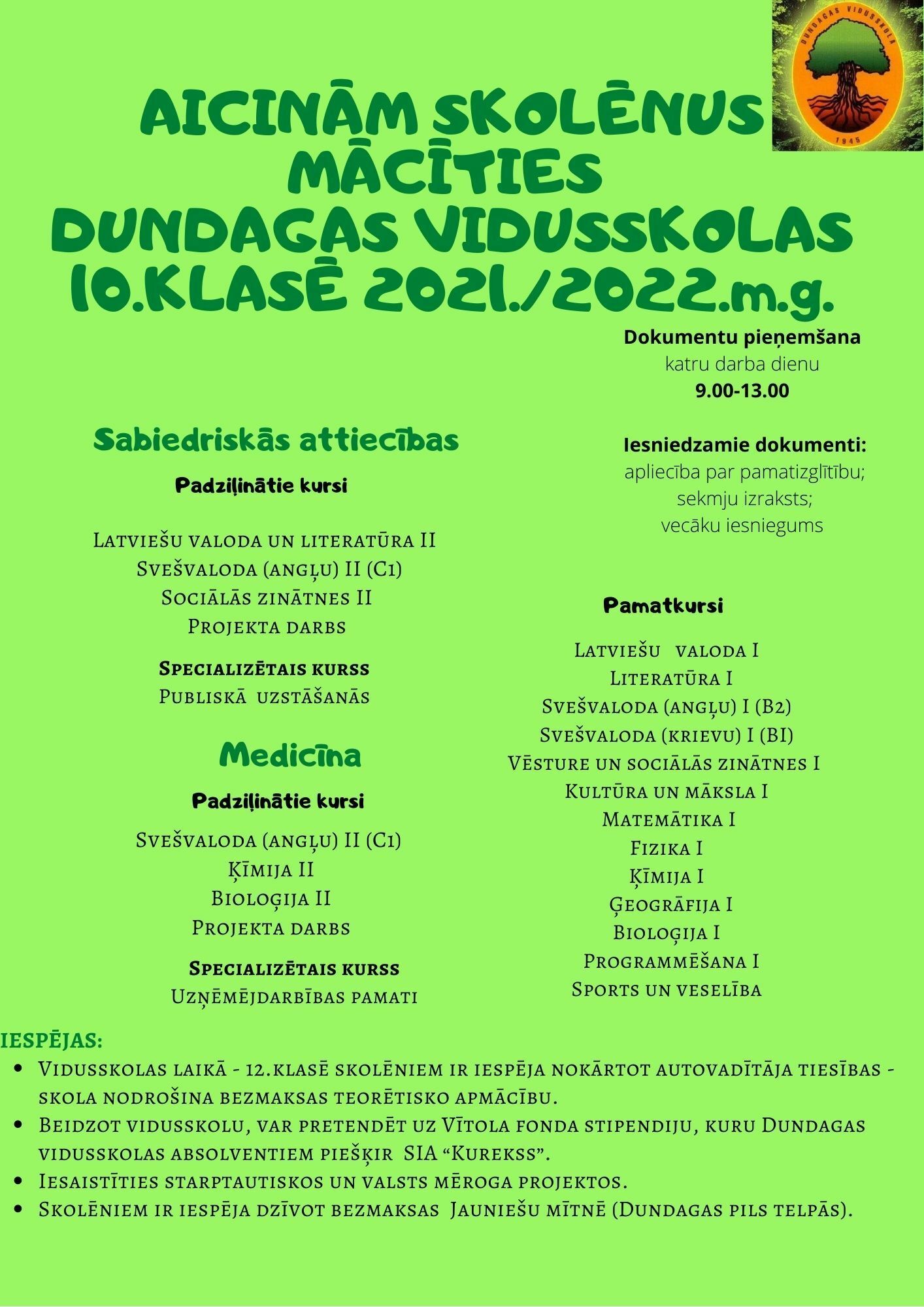 Aicinām skolēnus mācīties Dundagas vidusskolas 10.klasē