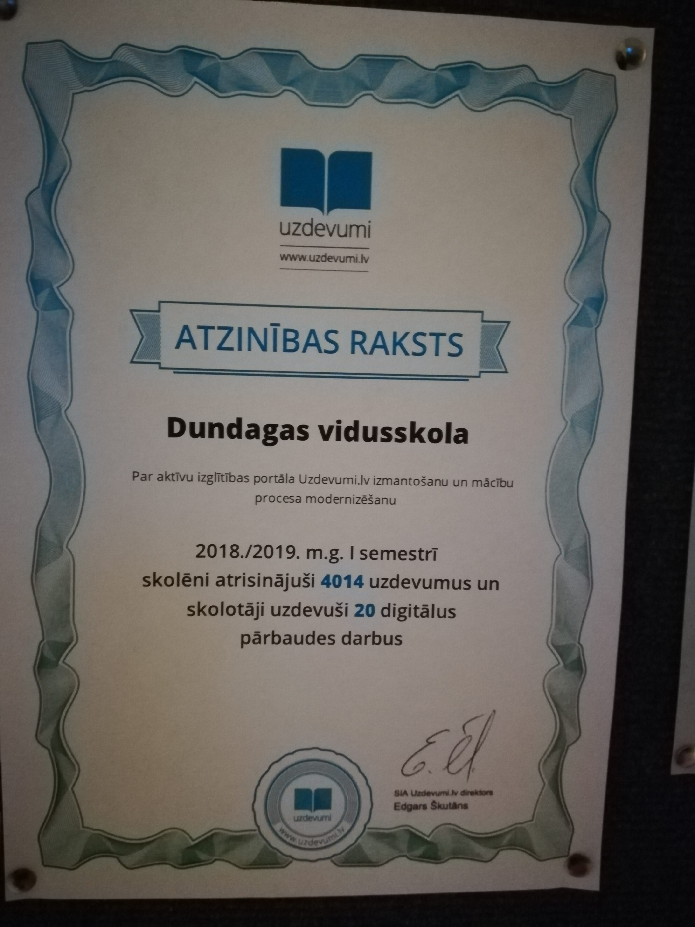 Esam saņēmuši Atzinības rakstu no izglītības portāla „Uzdevumi.lv” par aktīvu šī portāla izmantošanu un mācību procesa modernizēšanu.