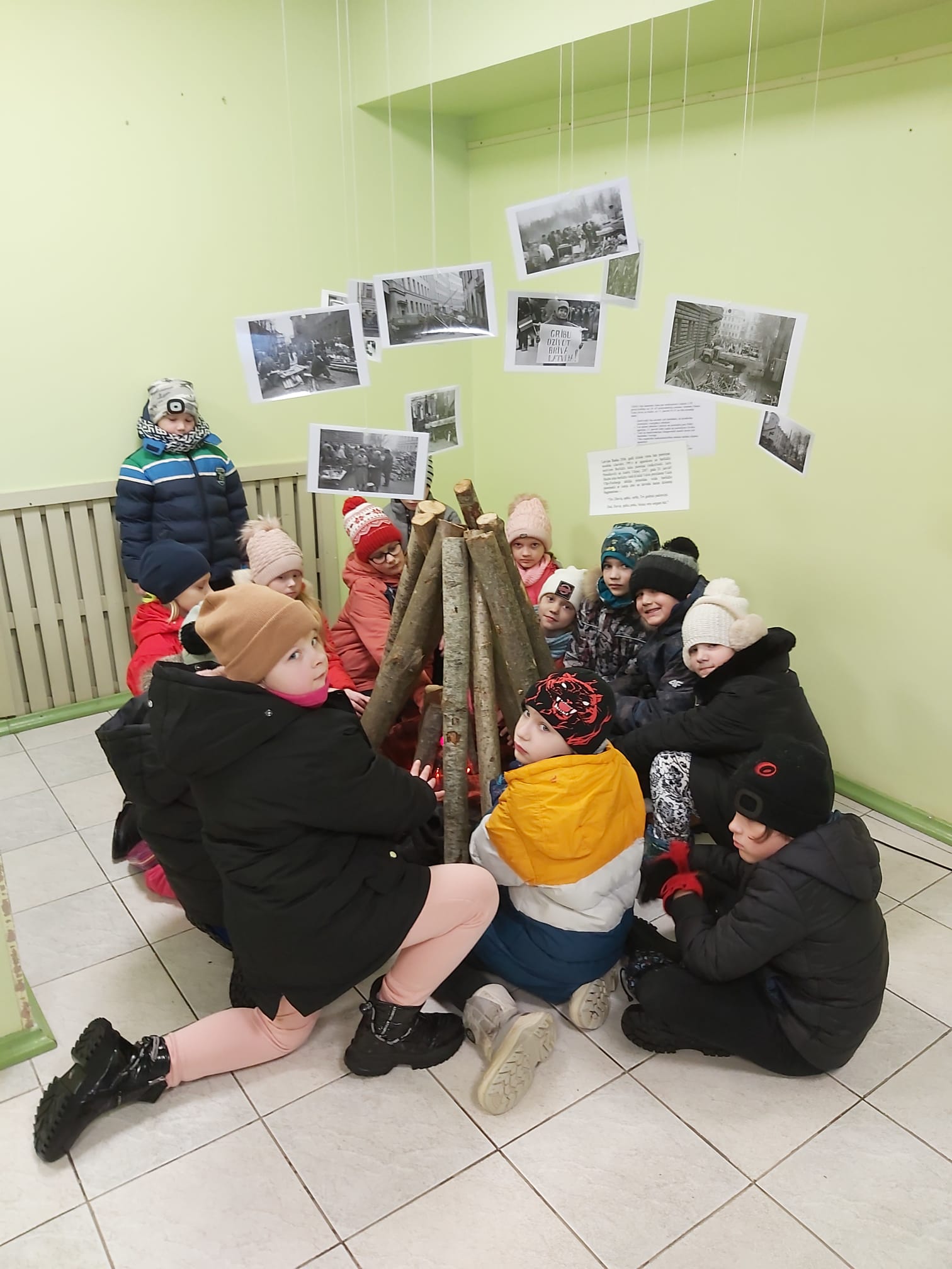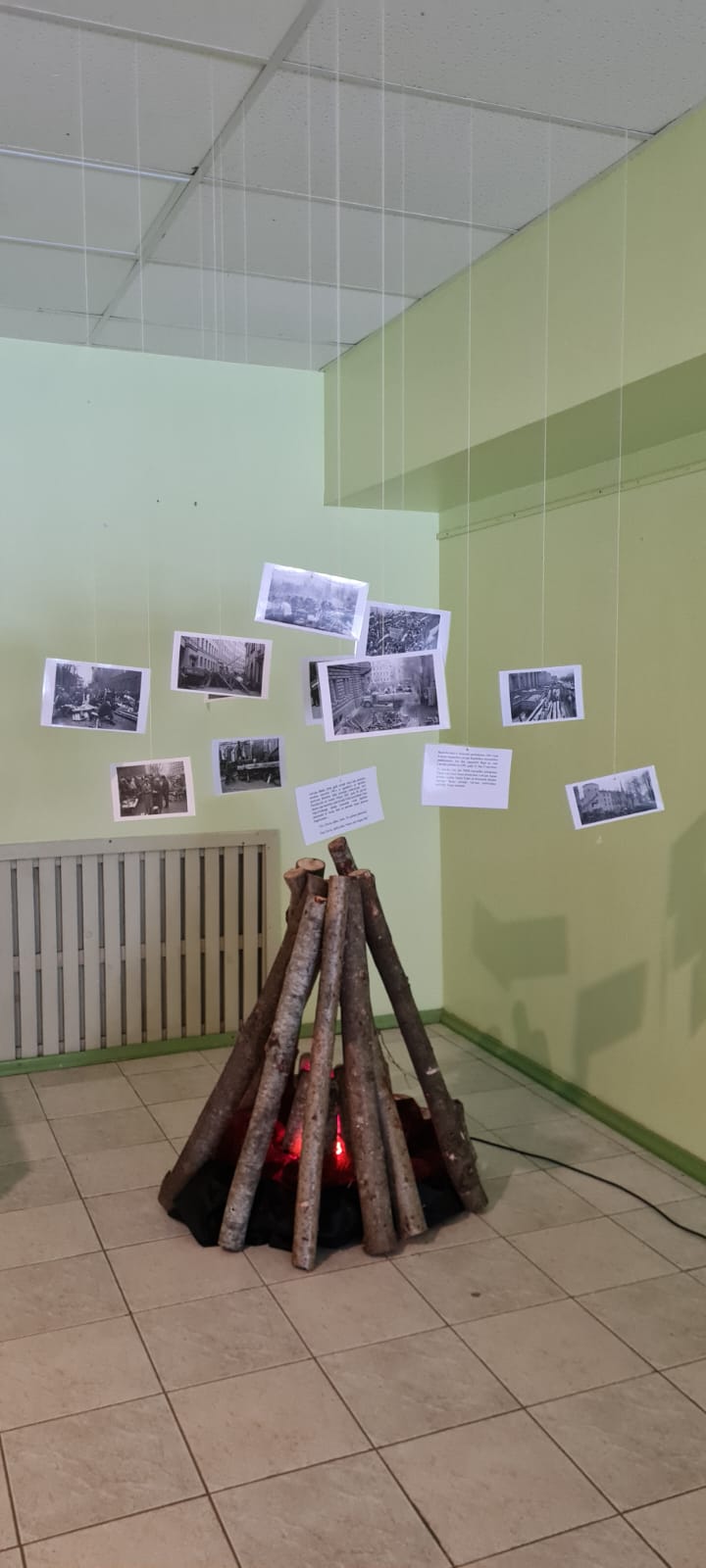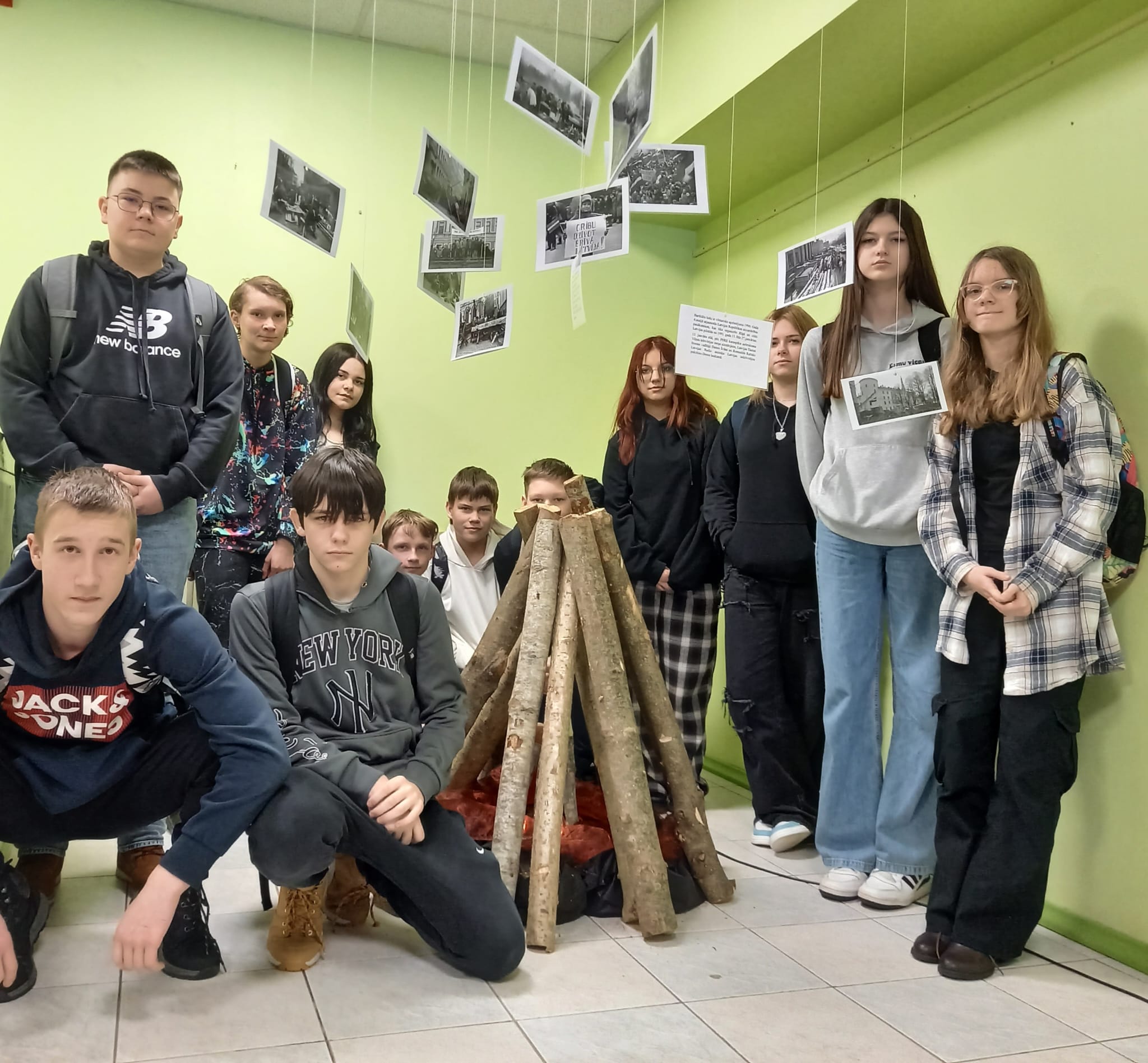 Skolas foajē ir apskatāma instalācija ar simbolisku ugunskuru “Barikāžu laiks”