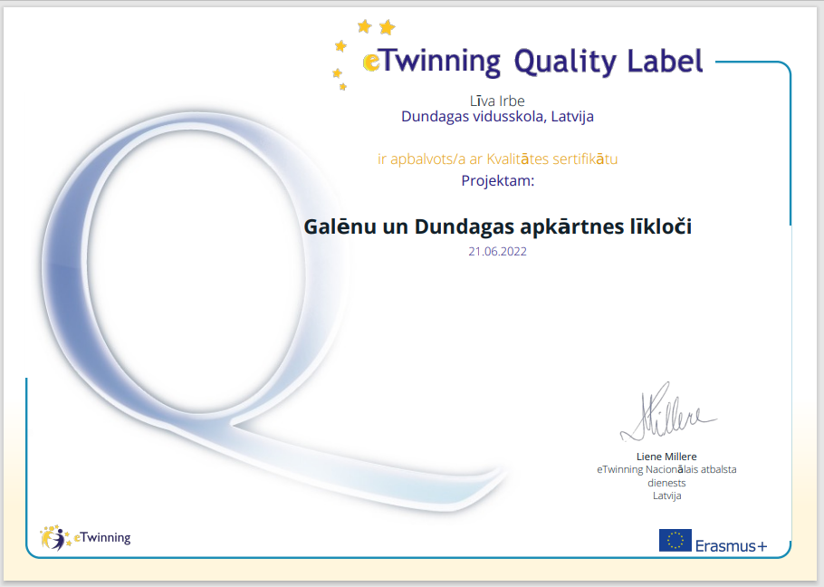 eTwinning projektam “Galēnu un Dundagas apkārtnes līkloči” piešķirts Nacionālais kvalitātes sertifikāts.