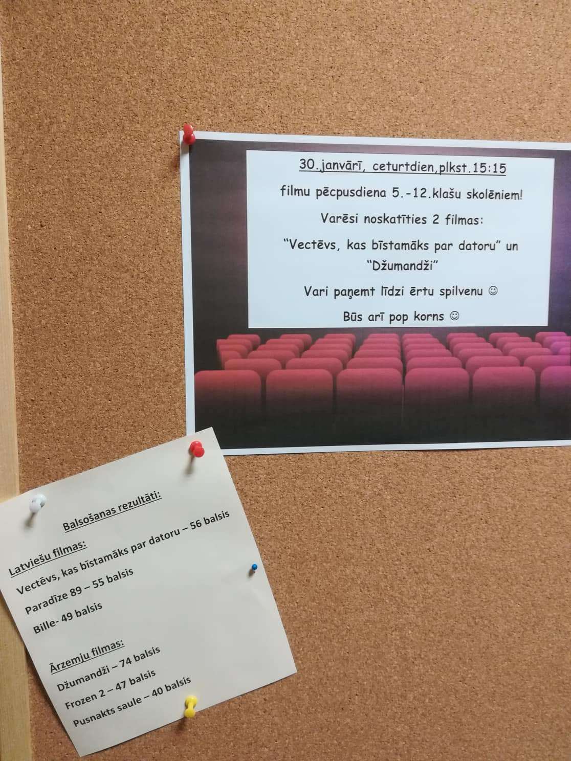 Lai filmu pēcpusdiena būtu dažādu kinomīļu gaumēm atbilstošs un baudāms pasākums, lai tiktu noskaidrotas filmas demonstrēšanai, vispirms skolēnu pašpārvalde devās klasēs un veica aptauju – ikvienam skolēnam bija iespēja nobalsot par sev tīkamu filmu (skolēnu pašpārvalde iepriekš bija izraudzījusies filmas, kuras piedāvāja balsojumam). Mazajā skolā skolēni varēja izvēlēties vienu latviešu mākslas filmu, bet Lielajā skolā varēja izvēlēties vienu latviešu mākslas filmu un vienu ārzemju mākslas filmu. Balsošana noritēja aktīvi – visi skolēni labprāt tajā iesaistījās. Mazās skolas bērni bija īpaši priecīgi par šādu aktivitāti, jo viņu skolā šāds pasākums notika pirmo reizi. Mazajā skolā lielāko balsu skaitu ieguva latviešu mākslas filma “Vectēvs, kas bīstamāks par datoru”, un Lielajā skolā arī lielākā daļa skolēnu nobalsoja par šo filmu, bet no piedāvātajām ārvalstu mākslas filmām visvairāk balsu ieguva piedzīvojumu filma “Džumandži”.