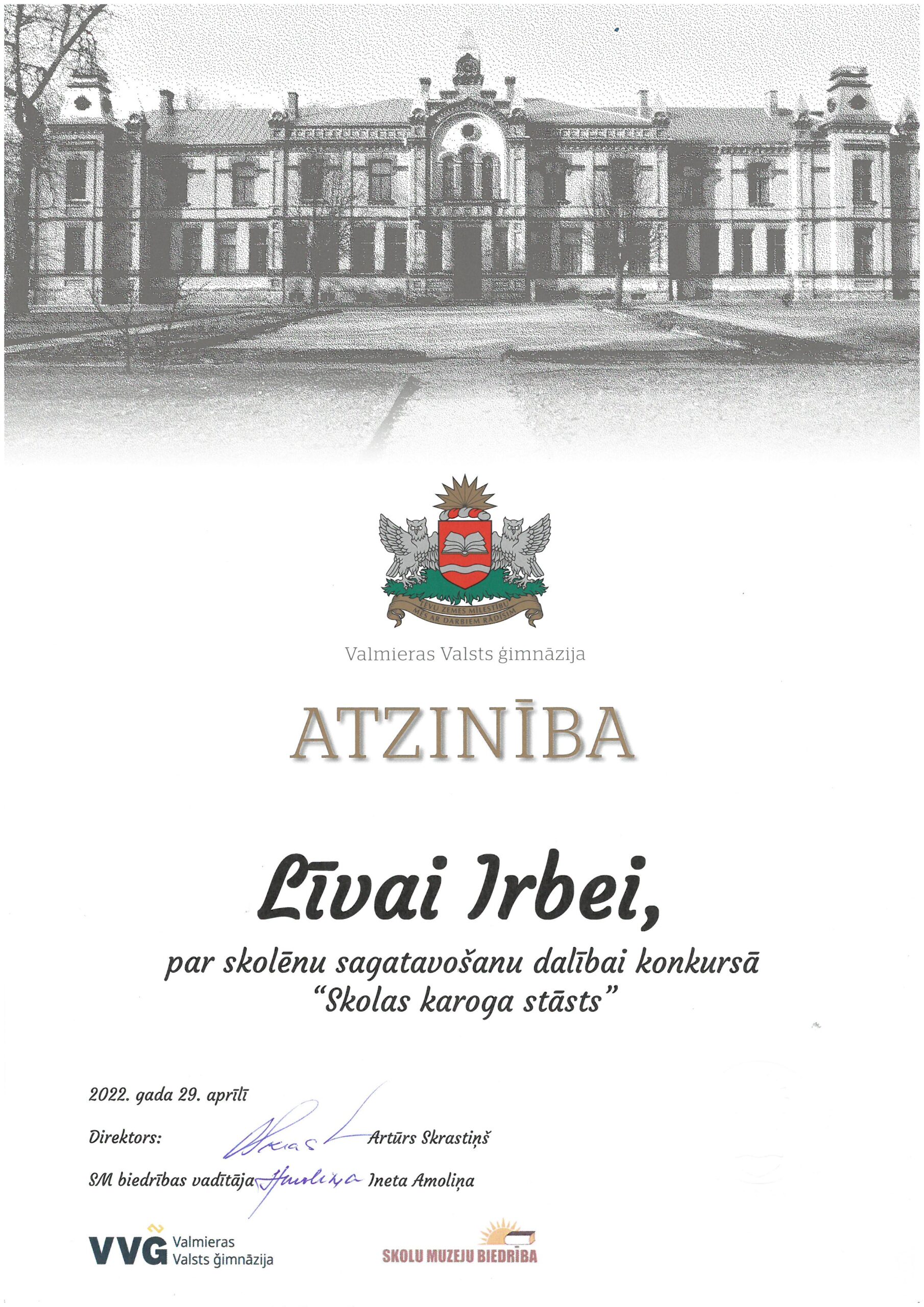 Konkursu rīkoja Latvijas Skolu muzeju biedrība sadarbībā ar Valmieras Valsts ģimnāzijas metodisko centru.