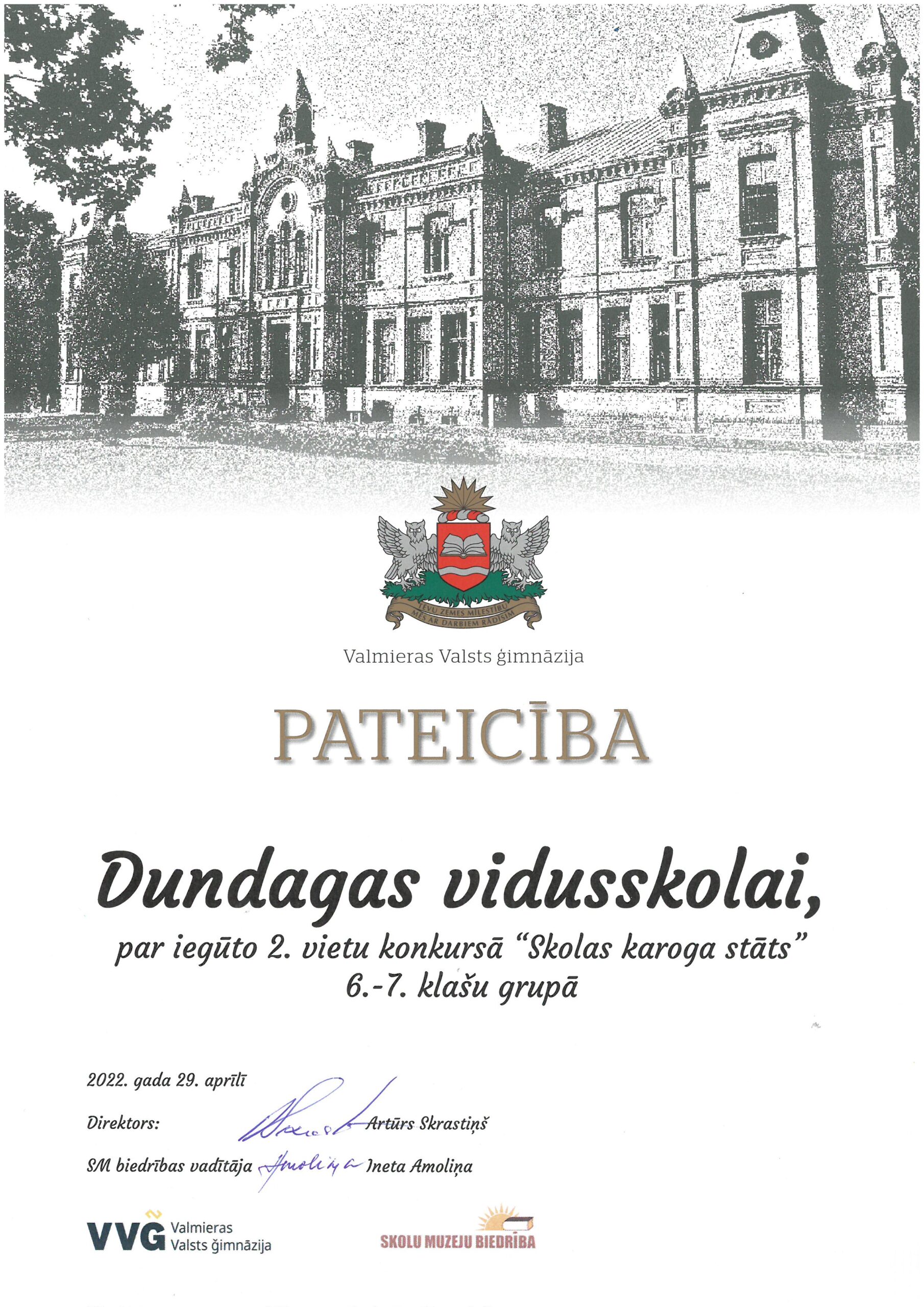 Latvijas Skolu muzeja biedrības izsludinātajā konkursā “Skolas karoga stāsts” 7.a klases skolniece Evelīna JAUNBIRZE ieguva II vietu 6. – 7.klašu grupā!