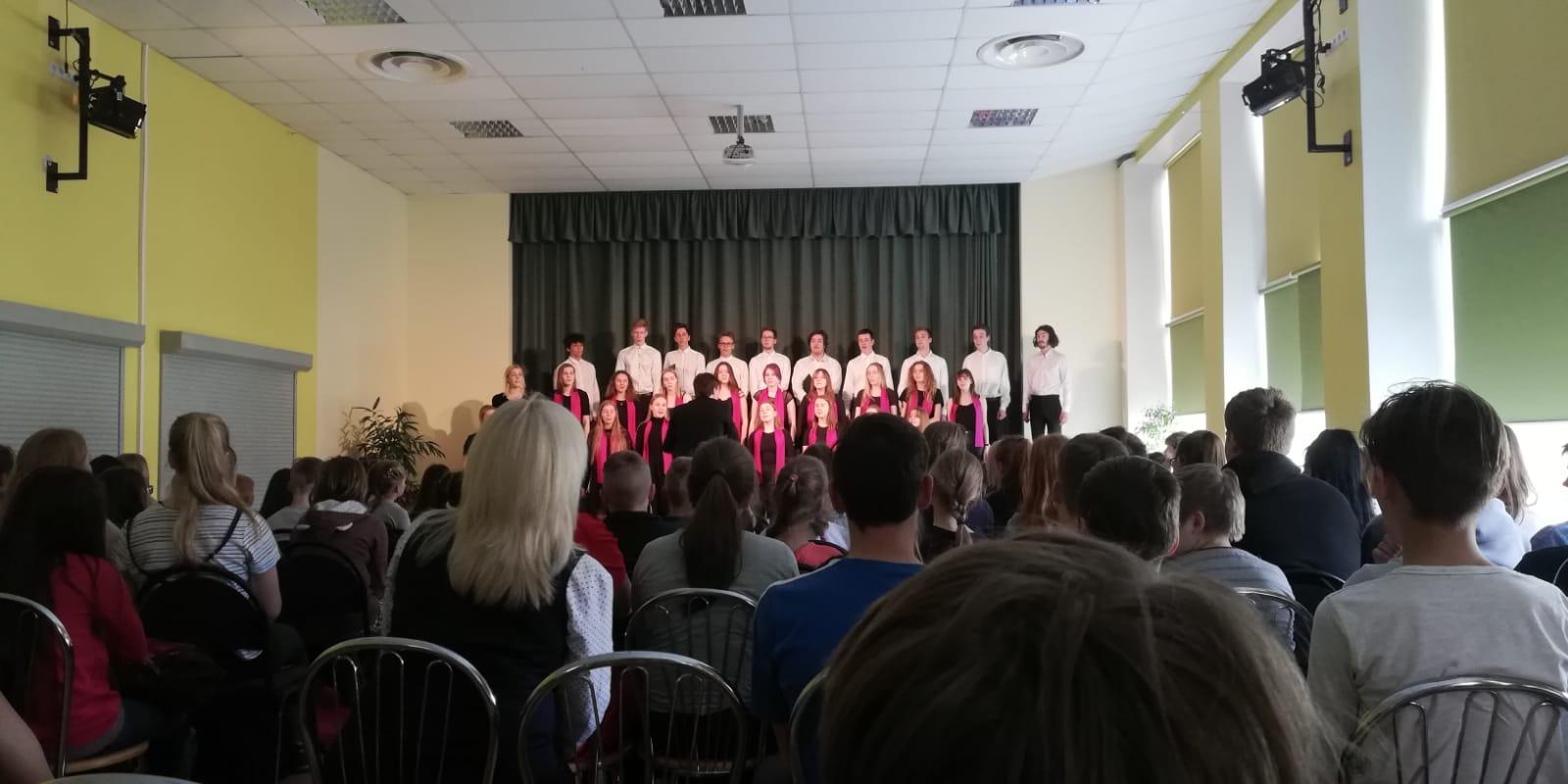 Koncertā skolas zālē klausītāju vidū bija arī mūsu 1.-4.klašu kora dziedātāji. Viņiem mūzikas skolotāja un kora vadītāja Sandra Cirvele bija devusi arī konkrētus uzdevumus. Mazās skolas koristi gan uzmanīgi klausījās Teikas vidusskolas jauktā kora sniegumu/dziesmu izpildījumu un solo dziedājumus, gan arī uzmanīgi vēroja koristu atdevi un dziedātāju sadarbību ar diriģentu.