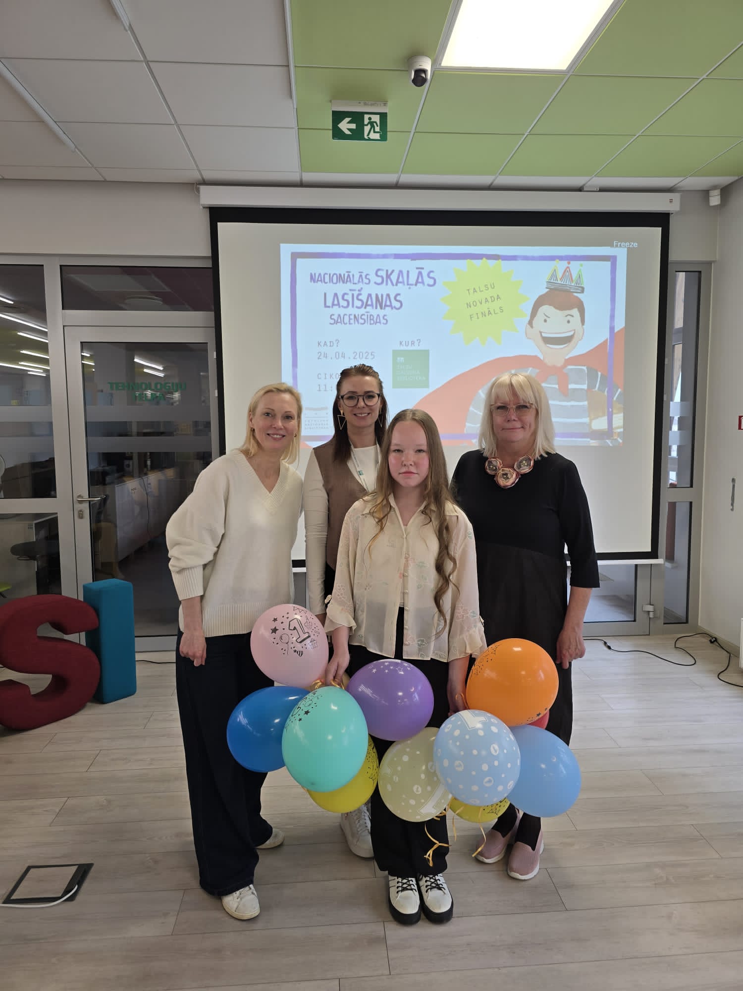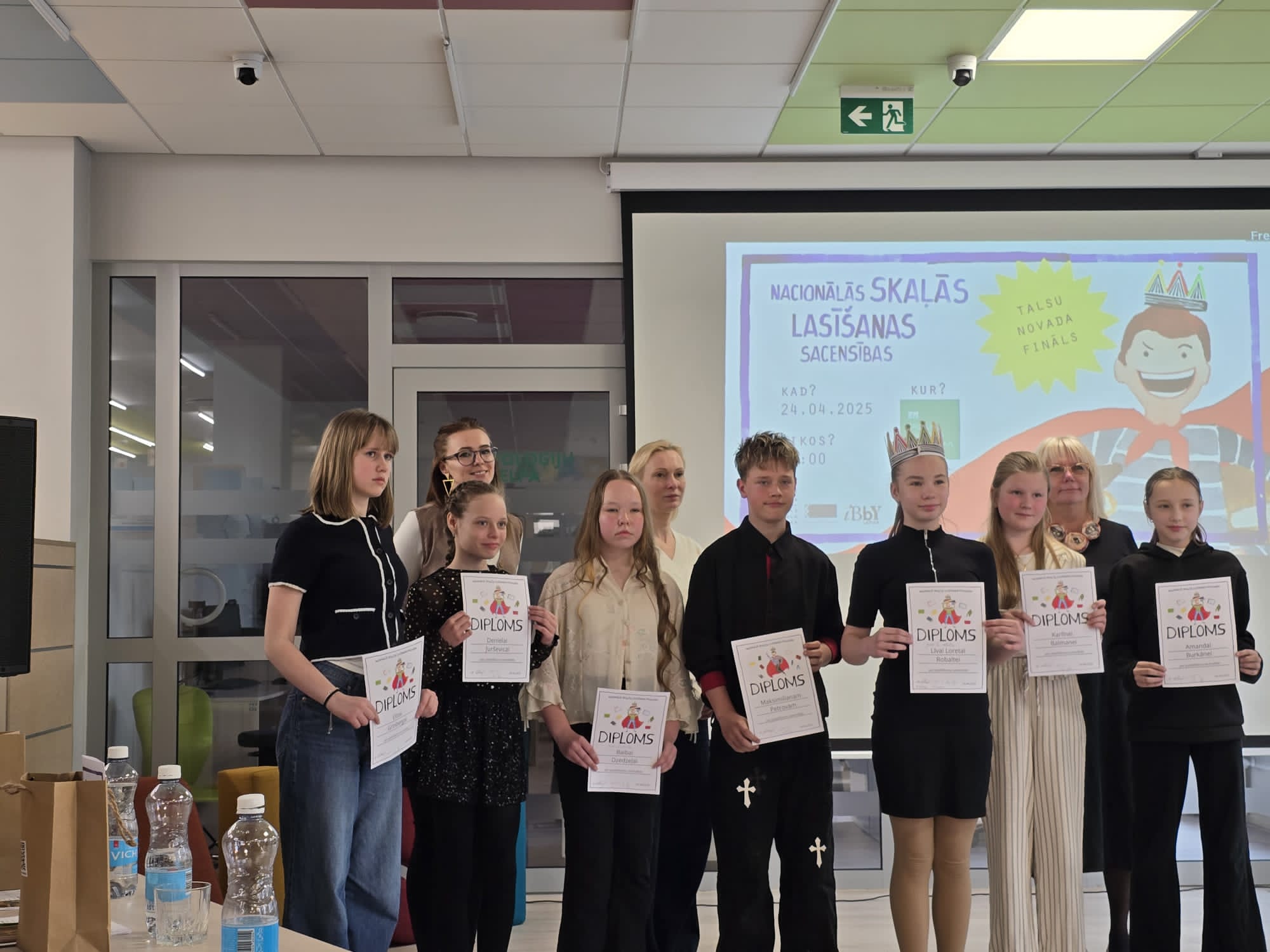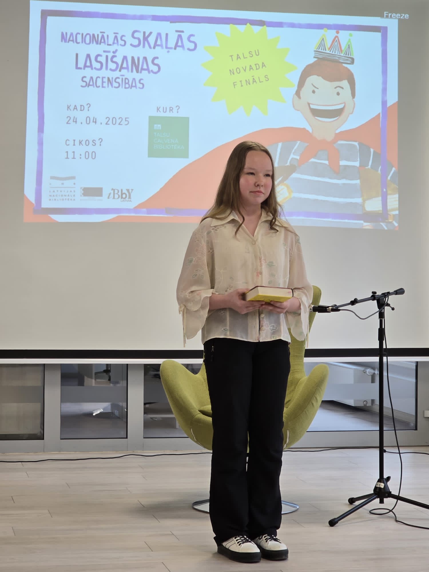 Apsveicam mūsu skolas 5.a klases skolnieci Baibu Dzedzeļu ar iegūto 2.vietu “Skaļās lasīšanas” reģionālajā finālā, kas šodien norisinājās Talsu Galvenajā bibliotēkā. Baiba lasīja fragmentu no Holijas Smeilas grāmatas “Nepiemērotā modele”. Paldies skolotājai Annai Līnai Neifeldei