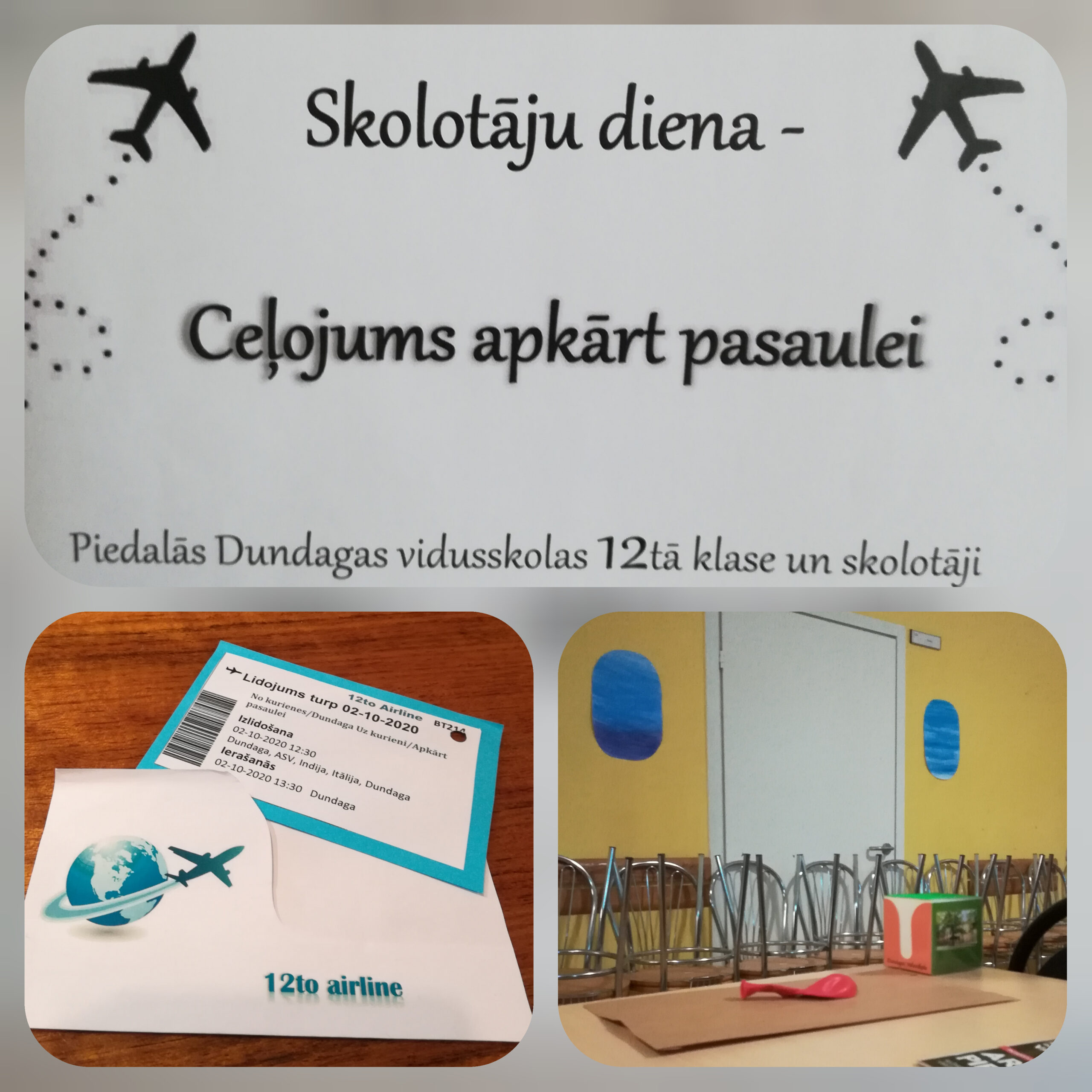 Pēc stundām 12.klase (klases audzinātāja Inese Ķiršakmene) aicināja skolotājus ceļojumā. Šogad divpadsmitie bija sagatavojuši skolotājiem tematisku pasākumu „Ceļojums apkārt pasaulei”. Katrs skolotājs jau iepriekš saņēma ielūgumu – lidojuma biļeti. Lai iekļūtu pasākumā (lai varētu piedalīties lidojumā), katram skolotājam bija jāiziet drošības kontrole (ieeja zālē bija izveidota ar līkloču norobežojumiem un ejām – gluži kā lidostā, tika pārbaudītas lidojumu biļetes, un katrs skolotājs tika reģistrēts lidojumam). Zālē vietas bija izkārtotas kolonnās un rindās ar krēsliem – kā lidmašīnā. Sajūtu, kā atrodoties lidmašīnā, radīja un pastiprināja arī iluminatori uz sienām. Stjuartes iepazīstināja ar drošības instruktāžu, uz katra galda atradās maisiņš sliktai dūšai un skābekļa maska (humora noskaņās), arī žurnāls lasīšanai. „12to Arline” lidmašīnas pilots sveica skolotājus, uzsākot lidojumu. Ceļojumā skolotāji nokļuva gan ASV, gan Indijā, gan Itālijā. Visi apsveikumi un priekšnesumi, uzdevumi bija saistīti ar ceļošanu, lidojumiem un šīm valstīm (piemēram, Indijā skolotājiem bija iespēja vērot indiešu dejotāju priekšnesumus, gan arī pašiem apgūt indiešu deju soļus, Itālijā skolotājiem bija iespēja apmeklēt meistarklases nodarbību itāļu pastas pagatavošanā). Visa lidojuma laikā skolotāji tika laipni apkalpoti – tika piedāvāta kafija, tēja un saldumi. Pasākuma izskaņā visi veiksmīgi atlidoja uz Latviju un nokļuva Dundagā, mūsu skolā, kur skolotājus svētkos sveica arī skolas direktore.