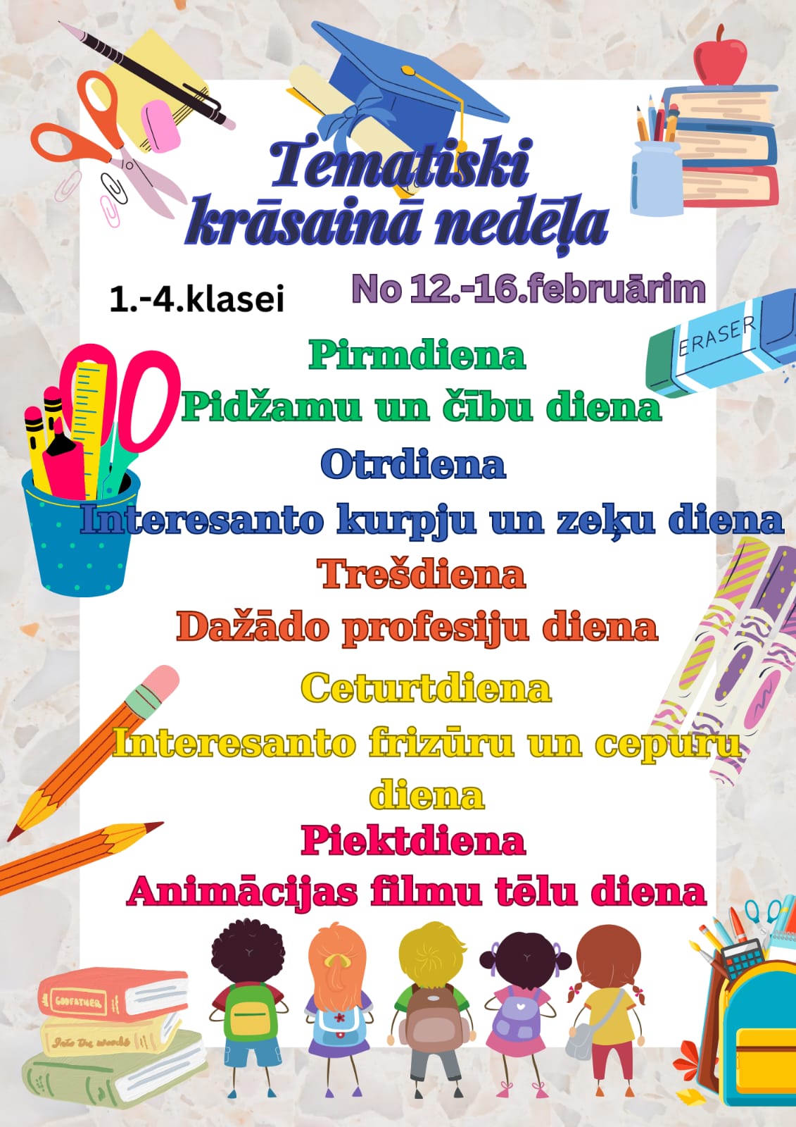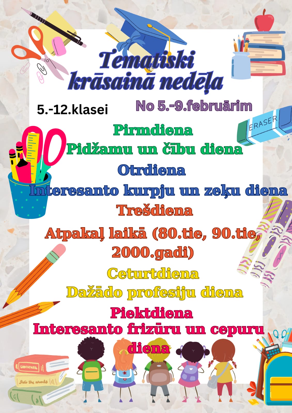 Skolēnu pašpārvalde aicina gan skolēnus, gan pedagogus piedalīties tematiski krāsainajā nedēļā! 1.-4.klasei no 12. līdz 16.februārim! 5.-12.klasei no 5. līdz 9.februārim!