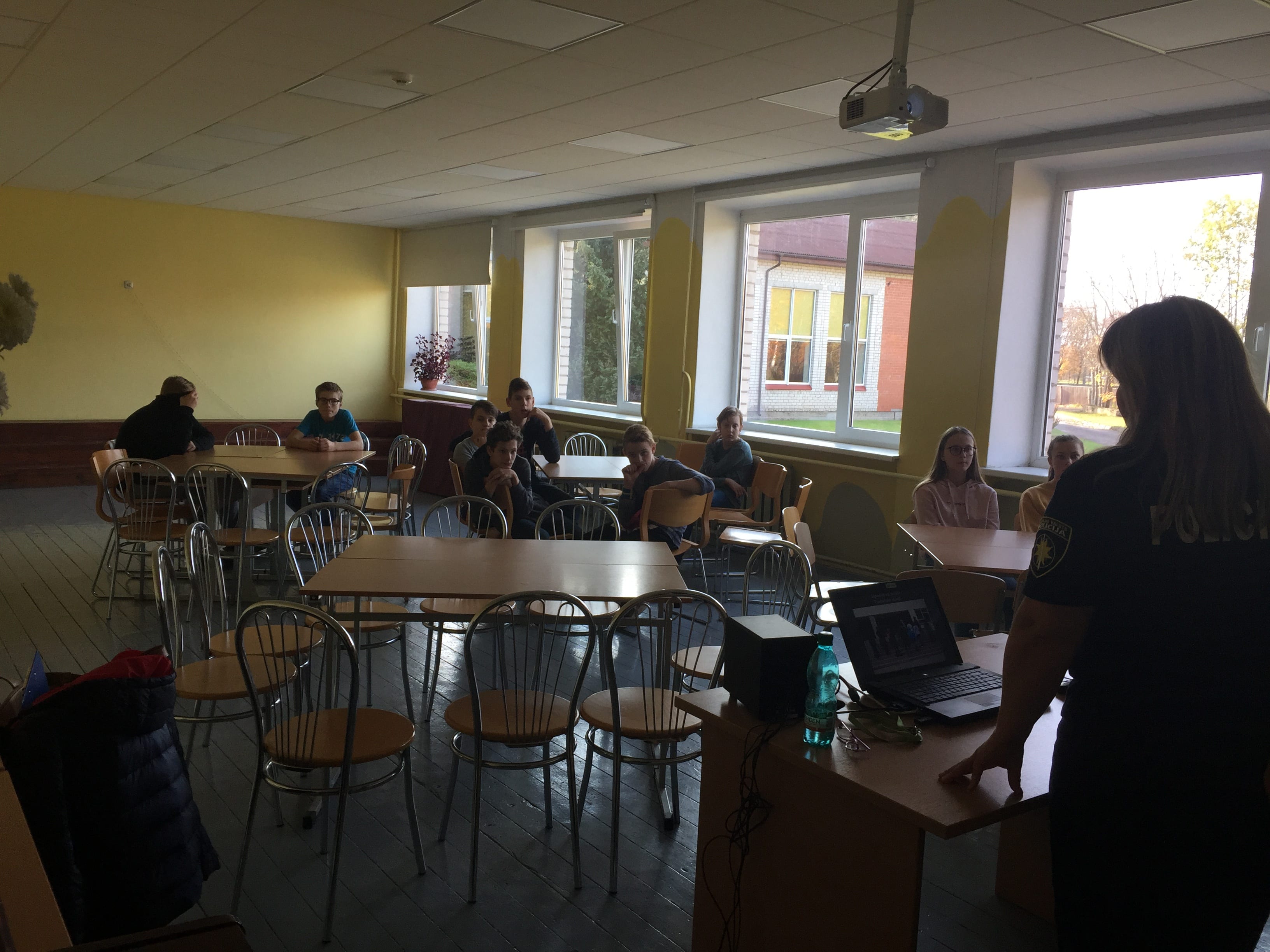 16.10.2019. mūsu skolā viesojās Valsts policijas nepilngadīgo lietu inspektore Evita Alksnīte, kura tikās ar skolēniem un stāstīja par tēmu “Atpazīsti un novērs –  vardarbība skolā!” Tajā tika  runāts par vardarbības veidiem – fizisko, emocionālo un ignorēšanu jeb atstumšanu, pienākumiem un atbildību. Kā arī tika runāts par skolas iekšējo kārtības noteikumu ievērošanu skolā.