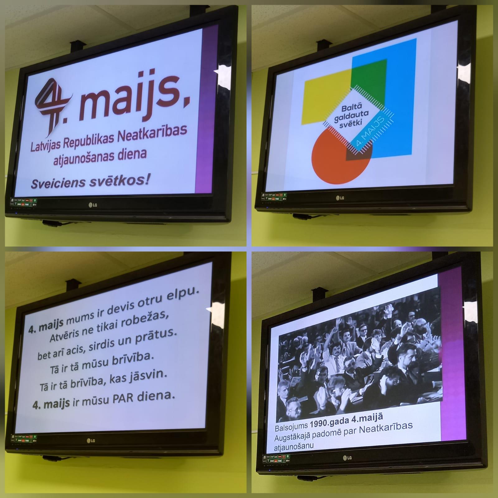 Lielās skolas foajē informatīvajā monitorā visas nedēļas garumā bija izlasāma informācija par 4.maija svētkiem, bija redzami vēsturiskie kadri ar fotogrāfijām – kā no toreizējās Augstākās Padomes (tagad – Saeimas) ēkas pēc vēsturiskā un nozīmīga balsojuma par neatkarības atjaunošanu 1990.gada 4.maijā iznāca toreizējās Latvijas PSR Augstākās Padomes deputāti, kā viņus sagaidīja tauta.  Skolēniem bija iespēja papildināt savas zināšanas par šiem svētkiem gan no šīs izglītojošās informācijas, gan arī klases stundās.