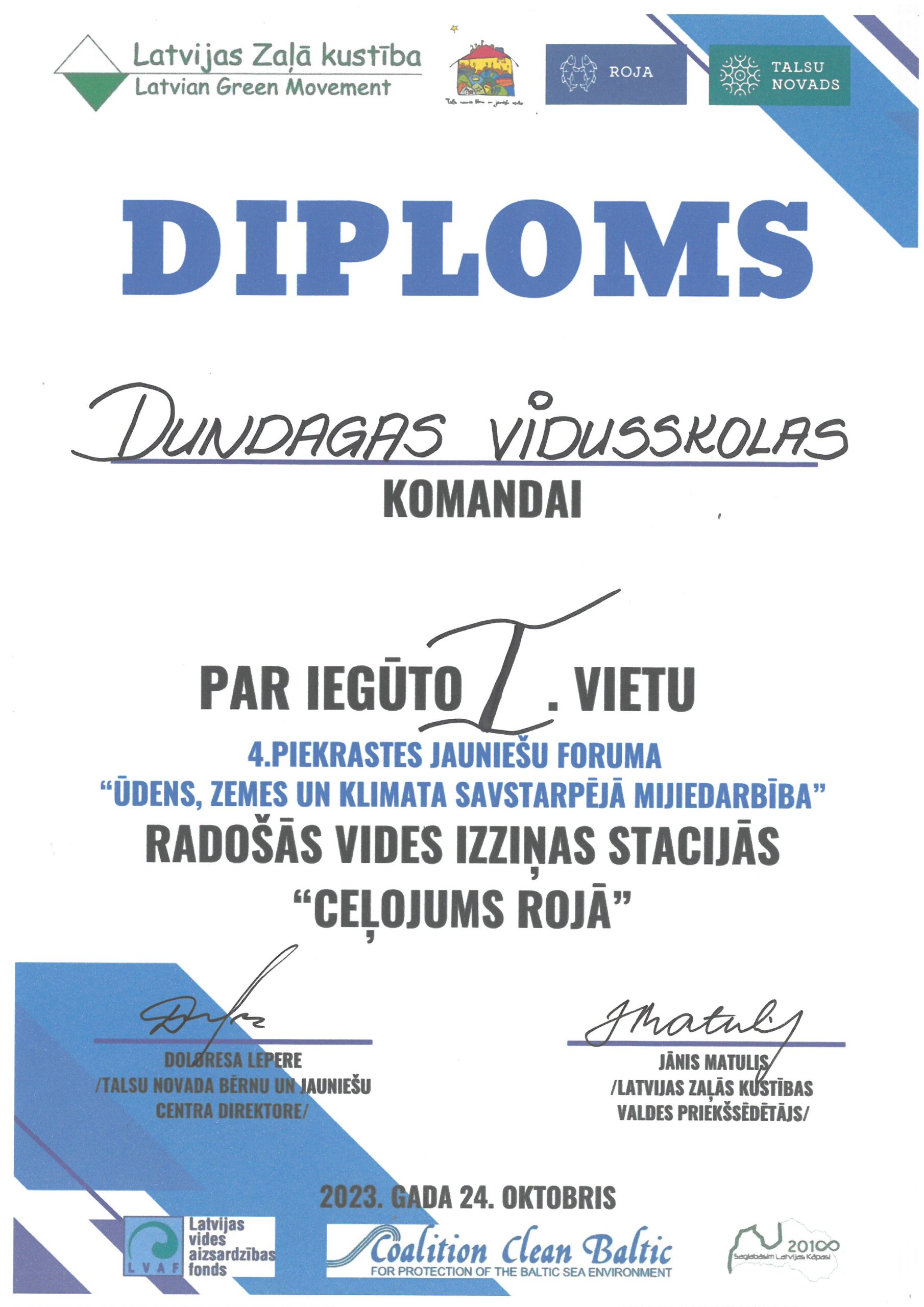 Pateicība Dundagas vidusskolas komandai un skolotājam Jurim ŠLEINERAM par dalību un iegūto 1.vietu 4.piekrastes jauniešu forumā “Ūdens, zemes un klimata savstarpējā mijiedarbība” RADOŠĀS VIDES IZZIŅAS STACIJĀS “CEĻOJUMS ROJĀ”, kurš norisinājās Rojā 24.oktobrī.